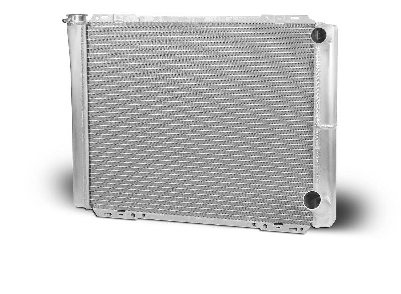 AFCO double pass GM style racing radiator 26" W x 19" T offers great fit and performance, along with an optimized fin count ratio for maximum cooling efficiency. ALL AFCO radiators offer a furnace brazed sealed core without the use of epoxy, and are all 100% tested before shipping. AFCO Double Pass provide more cooling over standard type radiators, with less than 2 oz. of added weight. Common temperature drops are 10-20 degrees when replacing a standard configuration radiator of equal core size. Keeps your mind off the water temp and puts it onto the race track. Double pass radiators gain their efficiency by first passing the fluid over the top half of the radiator and then the bottom half, giving the radiator the ability to dissipate heat twice. AFCO uses an exclusive 360 degree TIG-welded baffle that splits the radiator core into two sections. This 360 degree baffle effectively creates two radiators out of one and assures that you won't have any coolant that has entered the radiator but never made it across the core. This is superior to utilizing silicone to seal internal baffles, or worse, a partial weld that allows the coolant to bypass the radiator core completely. 360 Degree Welded - Internal baffle ensures no "short cuts" past the baffle due to internal leaks. Installation Instructions included.