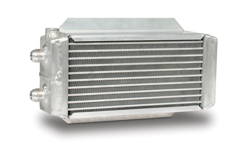 AFCO deck mount oil cooler double pass design optimum fin count ratio with oil tubular and louvered fins for maximum heat displacement. Has a 1 quart capacity and includes a 1" FPT oil temp sending bung including -12 AN inlet and outlet.