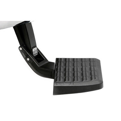 Strong and rugged, this non-slip, retractable bumper step quickly flips down with the nudge of a foot providing a faster, easier and safer way to load or unload the cargo from your pick-up truck. Supports up to 300 lbs. Frame mounts under the rear bumper so it works even with an open tailgate or when towing.