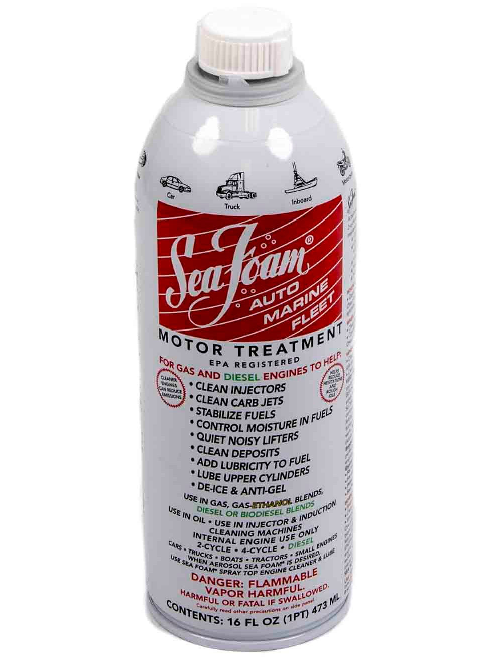 Suitable for gasoline or diesel-powered applications, SeaFoam motor treatment engine additive cleans the entire fuel system, liquifying gum and varnish deposits, while also including the ability to lube upper cylinders and quiet noisy lifters. Sold in a 16-ounce bottle.