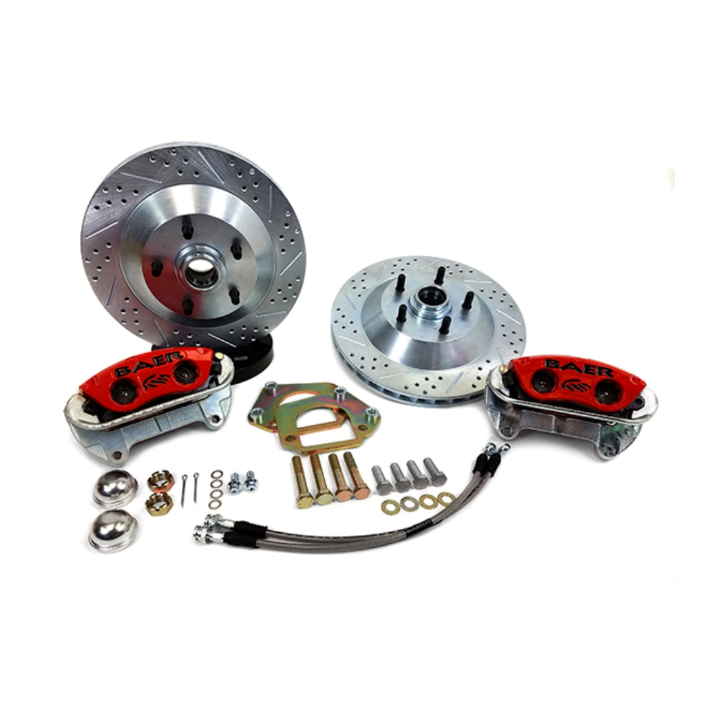 This system features the “Original” Baer 2-piston, pad guided caliper (PGC) mounted to a 13", 1-piece slot, drill, zinc plated integral hub rotor. The PGC caliper comes in a red powder coated finish with a black logo, includes dust/weather seal’s and uses the popular D412 pad type. The system includes premium bearings with races pre-installed, dust caps, mounting brackets, stainless braided hoses and all necessary hardware. The 13" “Classic” system fits select 17" or larger wheels.