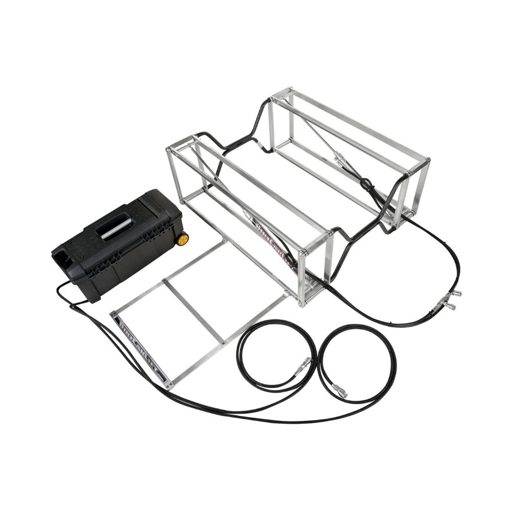 Affordable, yet highly effective race car lift combines a rigid, CNC-machined structure with a dual action, 12-volt powered 2,300 PSI hydraulic pump with quick disconnect couplers and cylinders to provide power up/power down hydraulics and a 4,000-lb. lifting capacity. Lift weighs just 67 lbs., and is 18" tall x 41" wide.