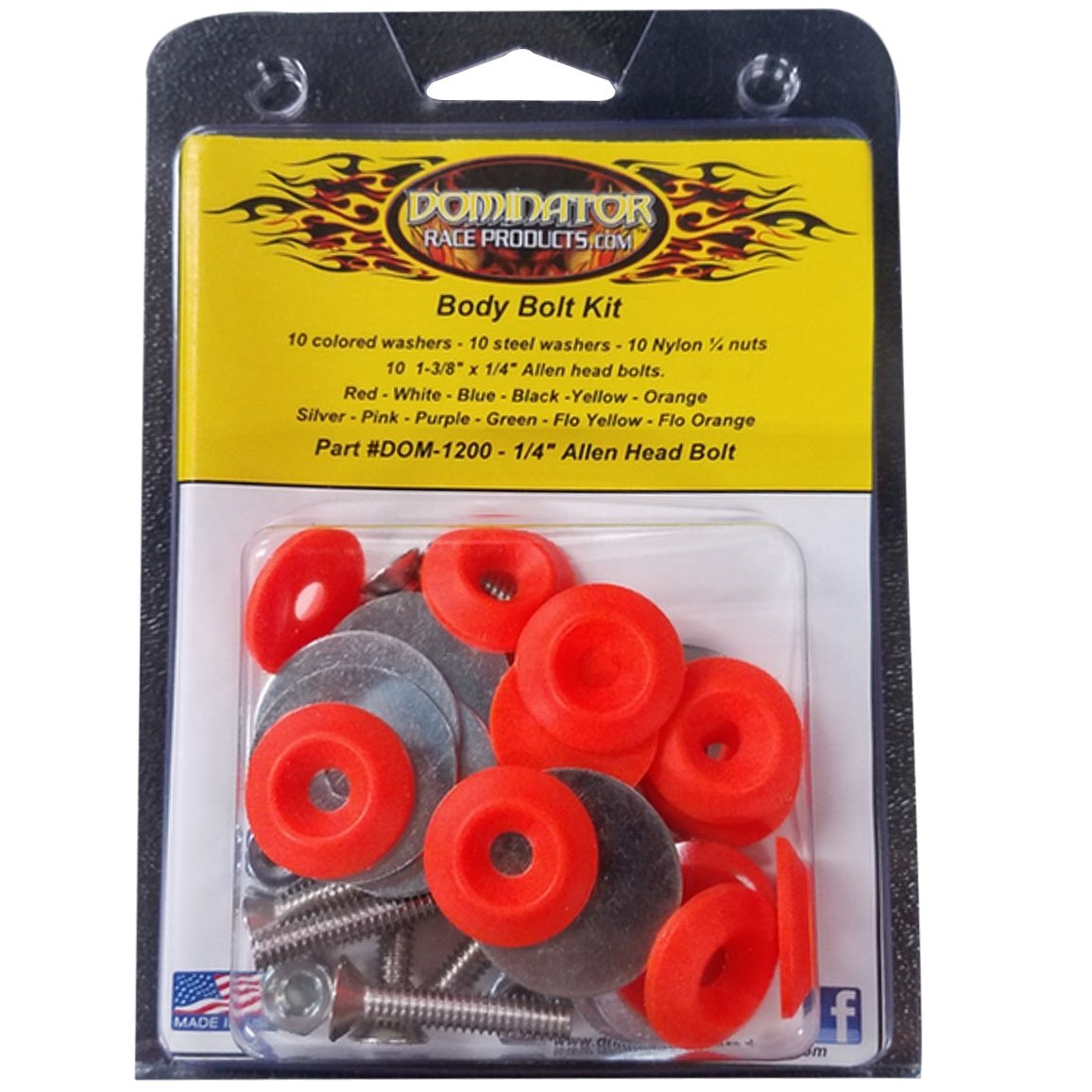 Countersunk Bolt Kit - 1/4-20 in Thread - 1.75 in Long - Allen Head - Countersunk Washers / Nuts - Plastic / Steel - Fluorescent Orange - Set of 10 - Brand: Dominator Race Products - Part Number: 1200-A-FLOOR
