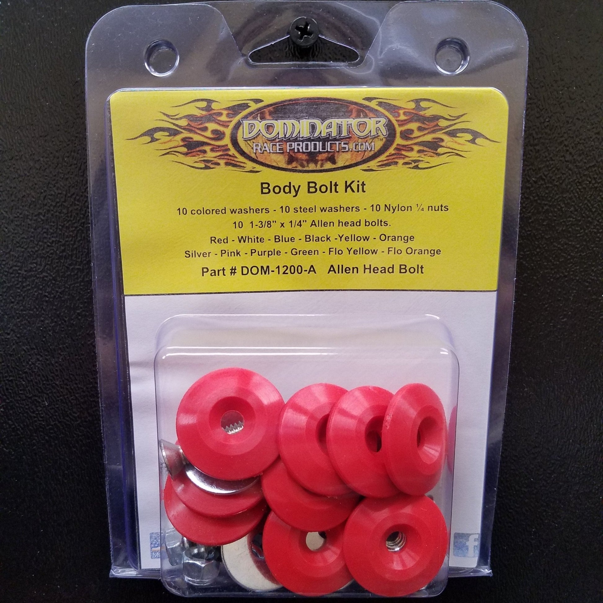 Countersunk Bolt Kit - 1/4-20 in Thread - 1.75 in Long - Allen Head - Countersunk Washers / Nuts - Plastic / Steel - Red - Set of 10 - Brand: Dominator Race Products - Part Number: 1200-A-RD