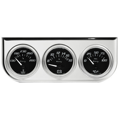 This attractive, durable, and affordable Equus 7000 Classic series triple 2-inch mechanical gauge console features elegantly styled black dial, chrome bezel, backlit instruments for monitoring oil pressure, water temperature and voltage. Installation hardware included. Additional adapters sold separately.