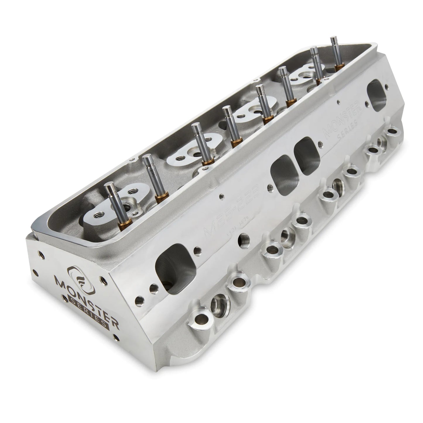 Small block Chevy, 23° aluminum cylinder head is fully CNC-ported, hand blended, and deburred to deliver exceptional air flow. Cylinder head features large, 223cc intake runners and 70cc combustion chambers, and is a angle plug design fitted with bronze valve guides. It is offered as bare, with premium stainless steel valves.