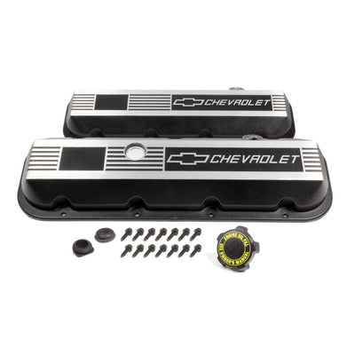 Valve Cover - Custom - Stock Height - Breather Hole - Hardware Included - Grommets - Chevrolet Logo - Aluminum - Black / Brushed - Big Block Chevy - Pair - Part Number: 12495488