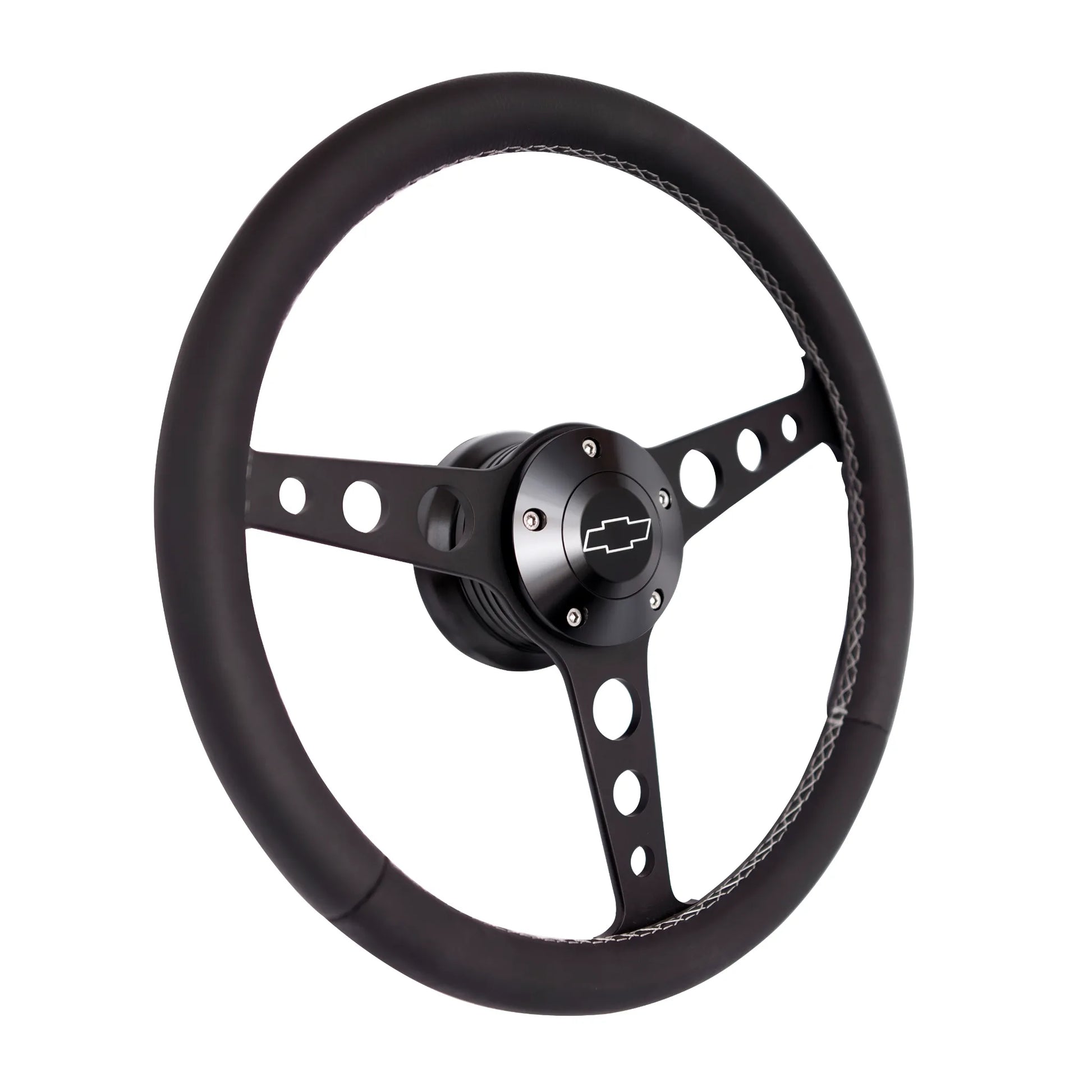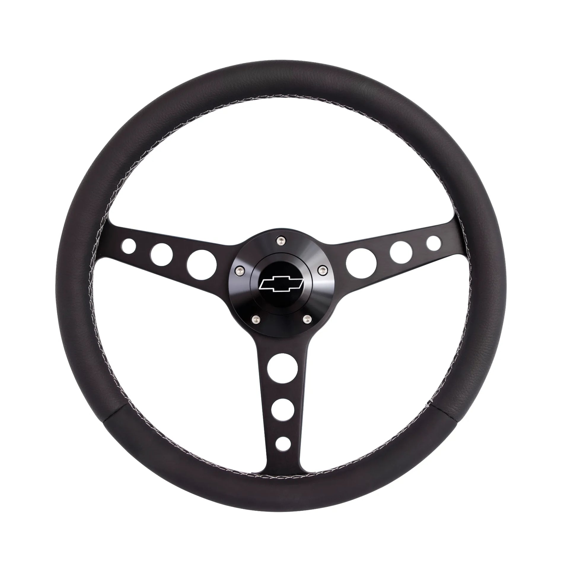 Steering Wheel - Classic Series - 14.75 in Diameter - 1 in Dish - 3 Spoke - Black Leather Grip - Chevrolet Bowtie Logo - Aluminum - Black Anodized - GM 1968-94 - Sold as Each - Brand: Grant - Part Number: 1926