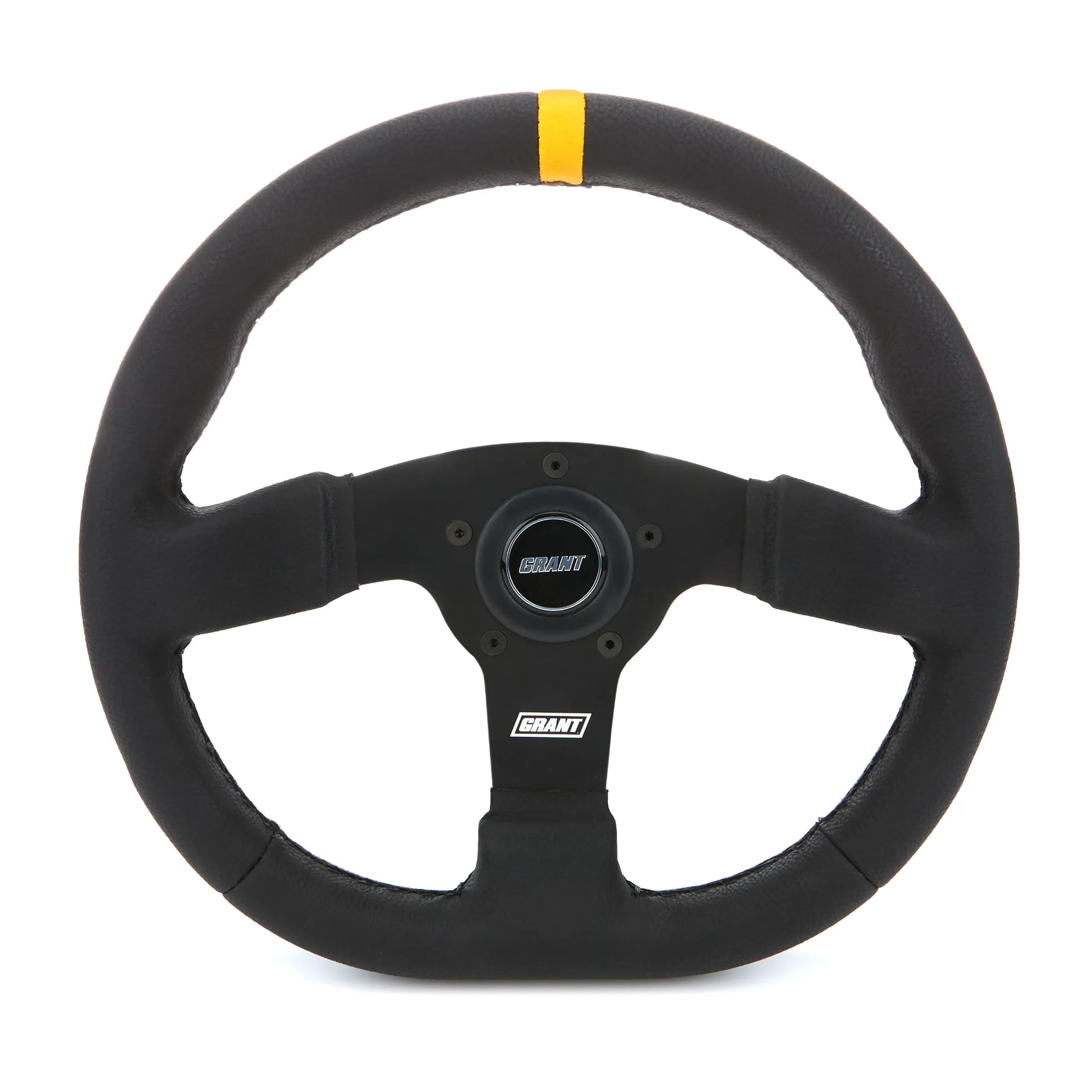 D Wheel Yellow Center Stripe Plastic Center - Steering Wheel, Performance Flat Bottom, 13 x 12.25 in Diameter, D-Shaped, 1 in Dish, 3-Spoke, Black Vinyl Grip, Yellow Stripe, Aluminum, Black Anodized - Brand: Grant - Part Number: 603-S