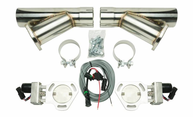 Pypes Dual Electric Cutout and Y-pipe Kit for 3 inch exhaust. Exhaust Cutouts Two 3 inch Diameter Stainless Y-Dumps, Two 3 inch Diameter Electric Cutouts Kit. This electric dump option can connect to any 3 inch exhaust system with an approximate 12 inch straight section and enough clearance for the motor/valve assemblies.