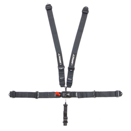 The Impact Racer Series 5-Point Latch & Link Harness has pull-up adjustments, a HANS compatible shoulder harness and is rated SFI 16.1.