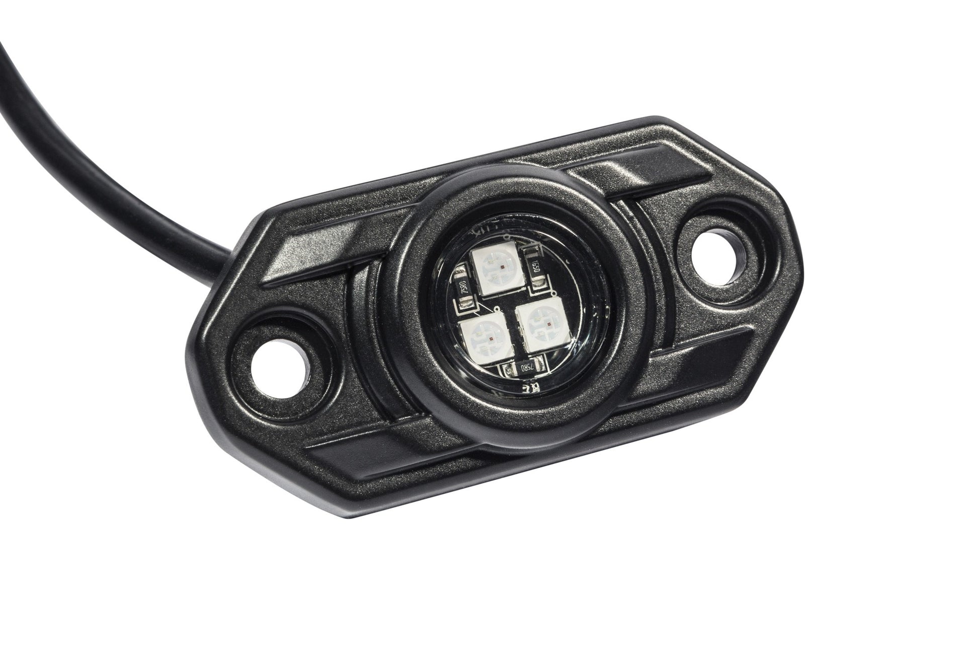 KC's RGB LED rock light kit puts you in full control offering endless color options and customization to meet your lighting preferences while improving night time visibility under and around your vehicle.