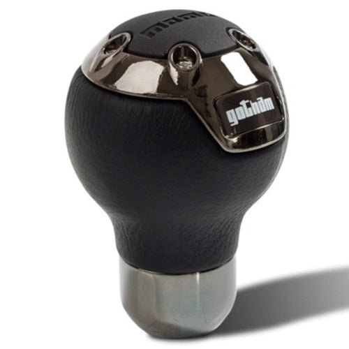 The MOMO Gotham shift knob is made of high quality top grain black leather on the lower half and a dark chrome insert on the upper portion. The shift knob is finished with a MOMO branded rubber top. The Gotham shift knob has a round shape that sits comfortably in the driver’s hand for over-hand or palm shifting. Other features include a Gotham logo emblem and a dark chrome collar.