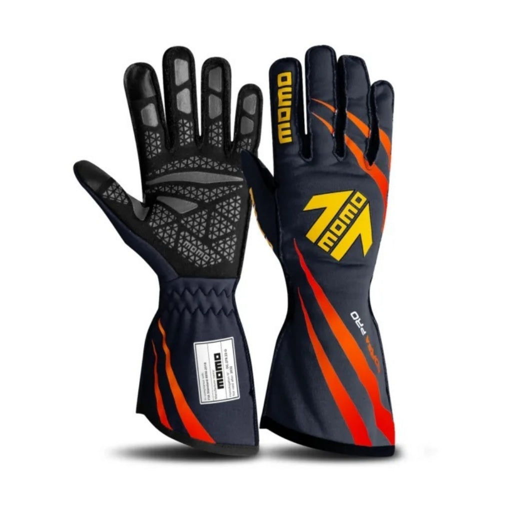 Momo Corsa Pro Night Gloves are FIA approved with a safety certification of FIA 8856-2018. These single-layer gloves are constructed of Nomex with Silicone palms. Corsa Pro driving gloves are available in sizes Small (09) to XL (12) and come in four stylish colors: Black, Navy Blue/Orange Fluorescent, Red, and White/Red.