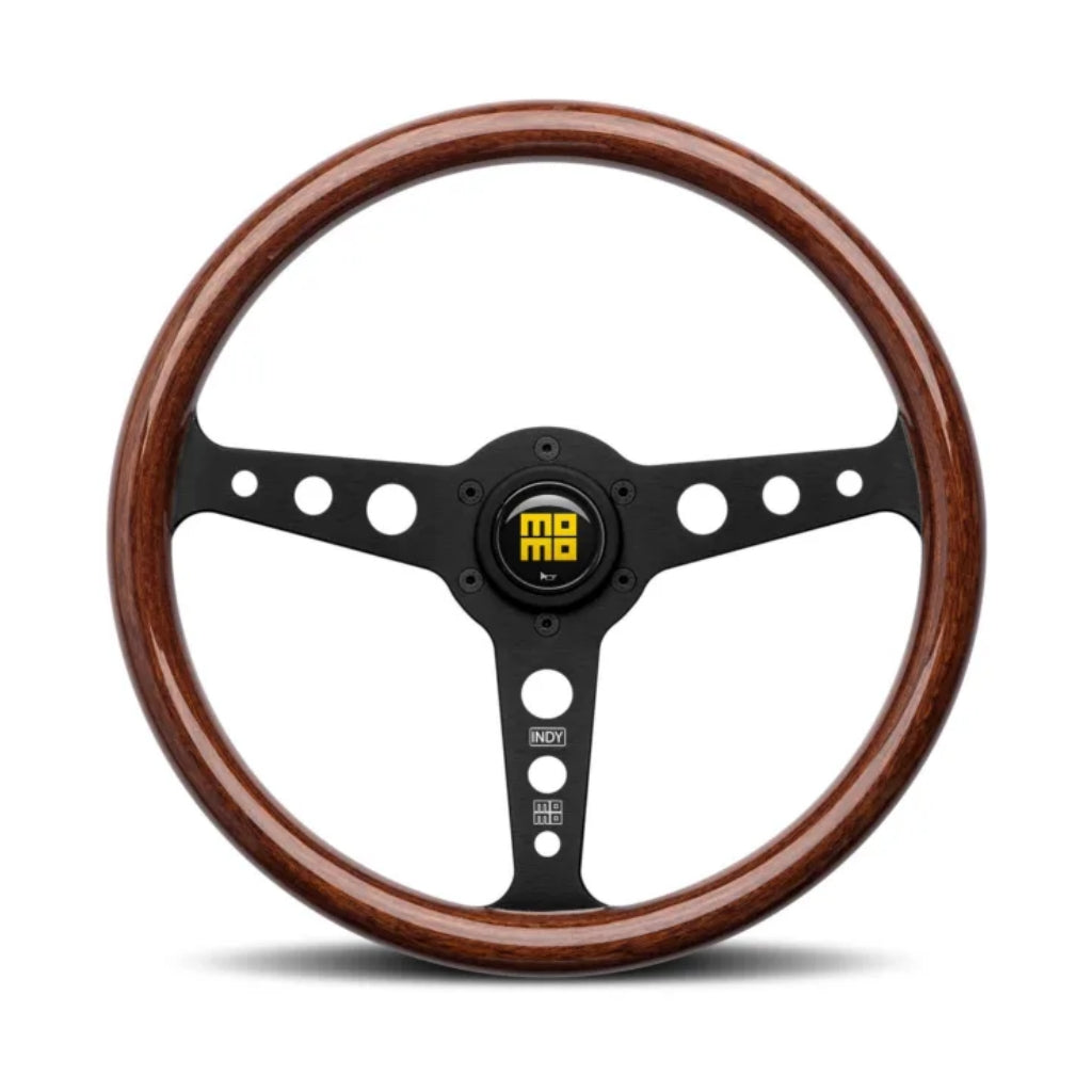 The Momo Indy Black Heritage steering wheel measures 350mm diameter and features black-anodized aluminum spokes with a laser-engraved "INDY" insignia. With a 37mm dish and mahogany wood grip with back finger grooves, this Heritage steering wheel blends performance with class.