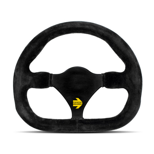 The anatomically-designed rim is covered with premium suede. A flat bottom gives the driver better leg clearance. The MOMO MOD 27 steering wheel has an anodized center with no drill holes.