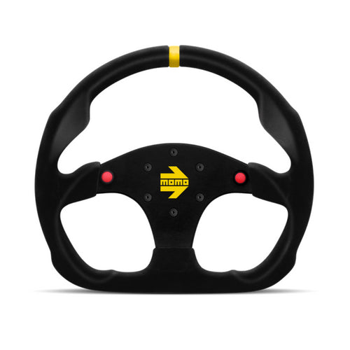 The MOD 30’s flat bottom design offers easier entering and exiting of the race car. The suede covered rim is anatomically molded for optimum grip. MOMO MOD 30’s steering wheel spokes and thumb rest give drivers thumb placement options dependent on their preferred hand position. Horizontal spokes have red push button switches.