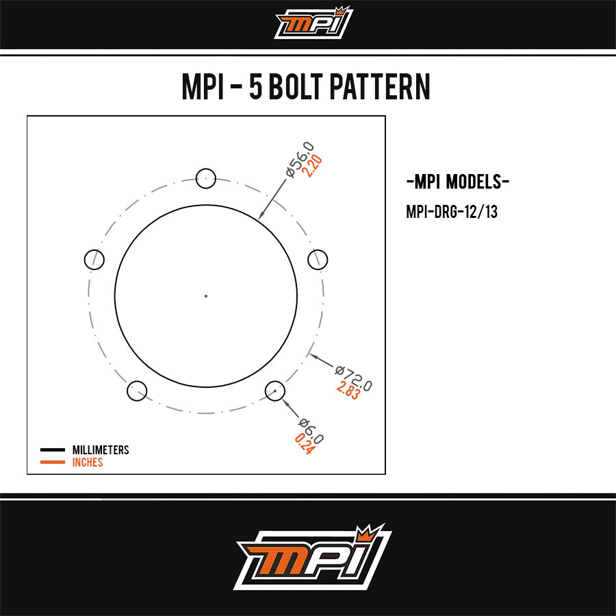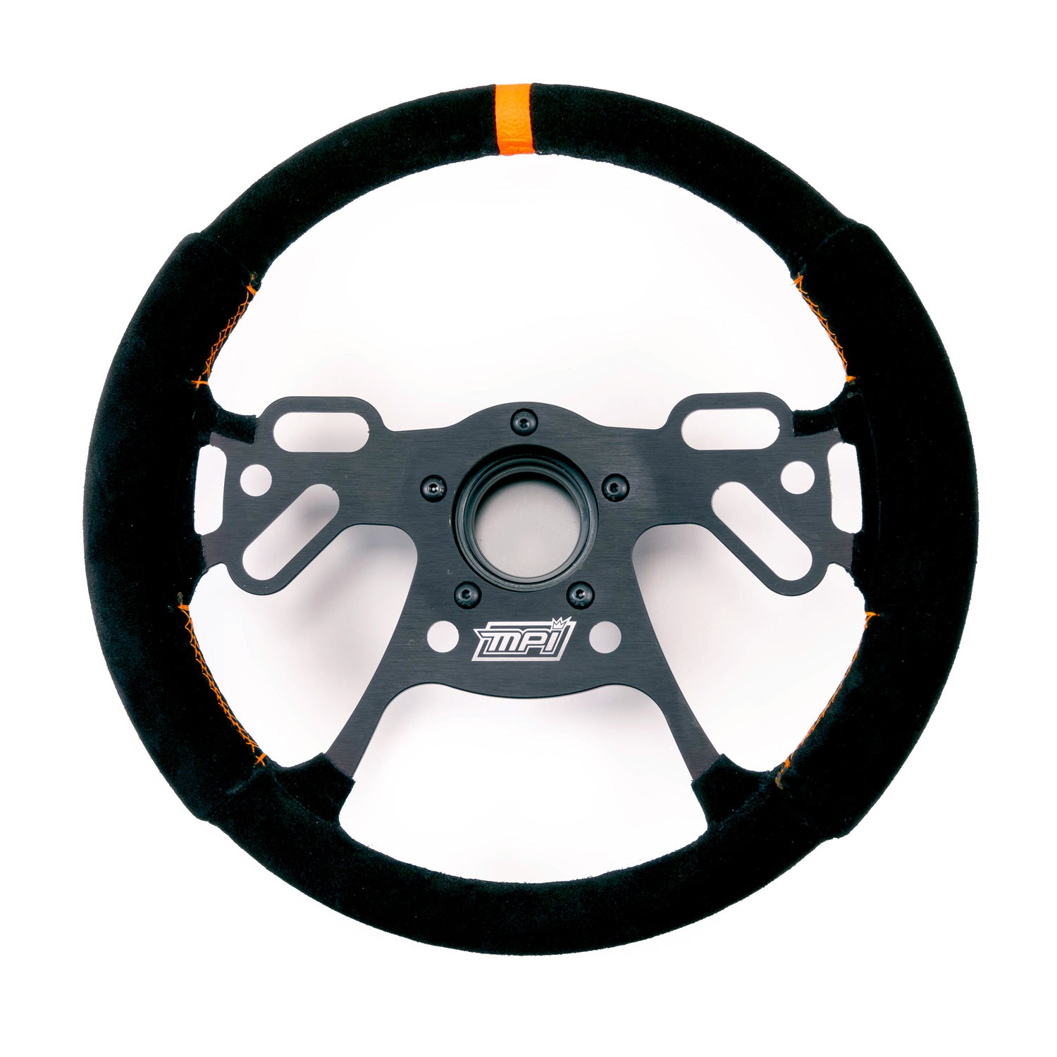 Three sizes are offered (10”, 12”, 13”) each with over 10 button locations, giving even the most demanding racers infinite adjustability. Each unit features: 4 small ½” holes, 2 small ½” x 1¼” slots, and 5 large 5/8” x 2” slots. The selected suede covering provides a high grip, natural feel, reducing the effort needed to hold the wheel while increasing driver feeling. The featured MPI Orange™ markers help both driver and crew chief have a visual reference of the steering wheel position. All models feature the standard drag racing 5 bolt pattern+ while the MPI-DRG-10 also includes 4 pilot holes for mini drag.