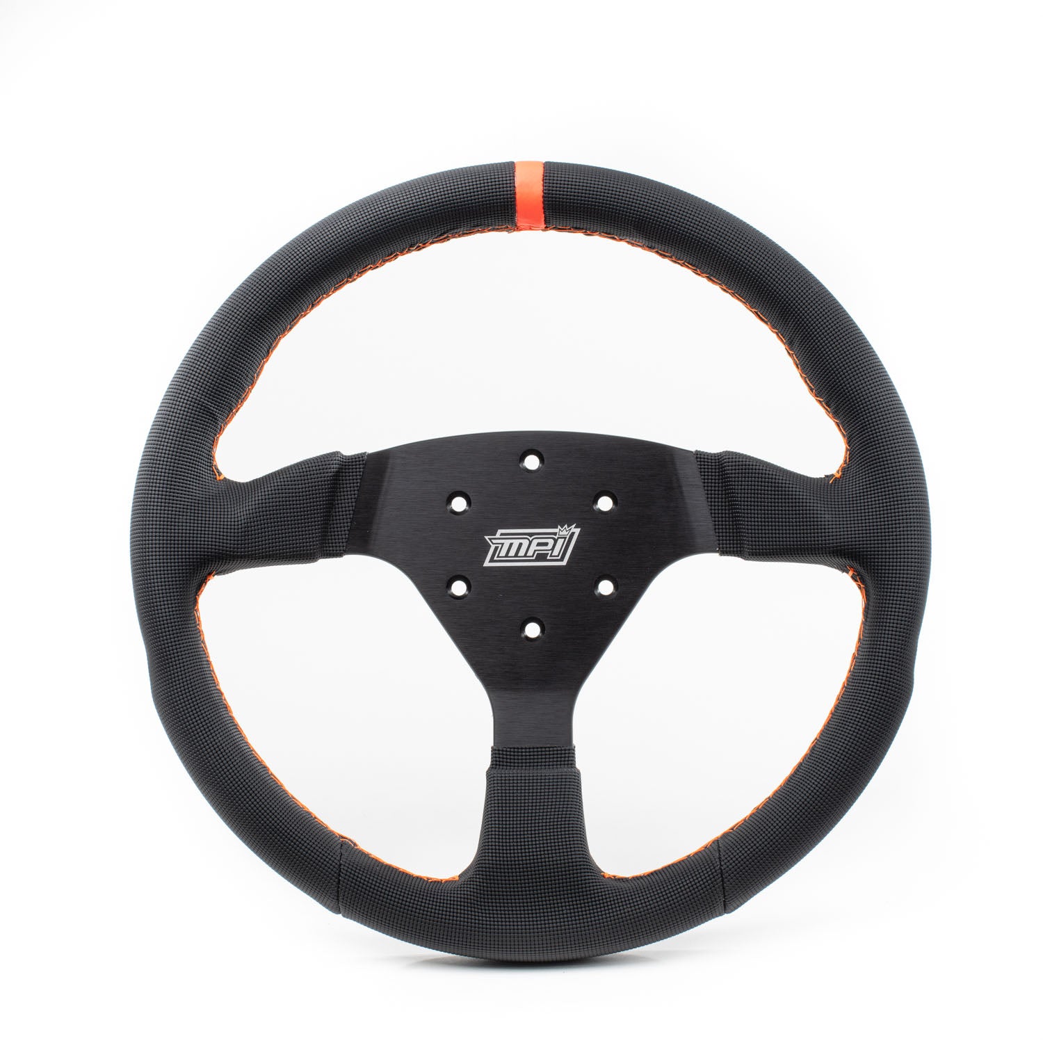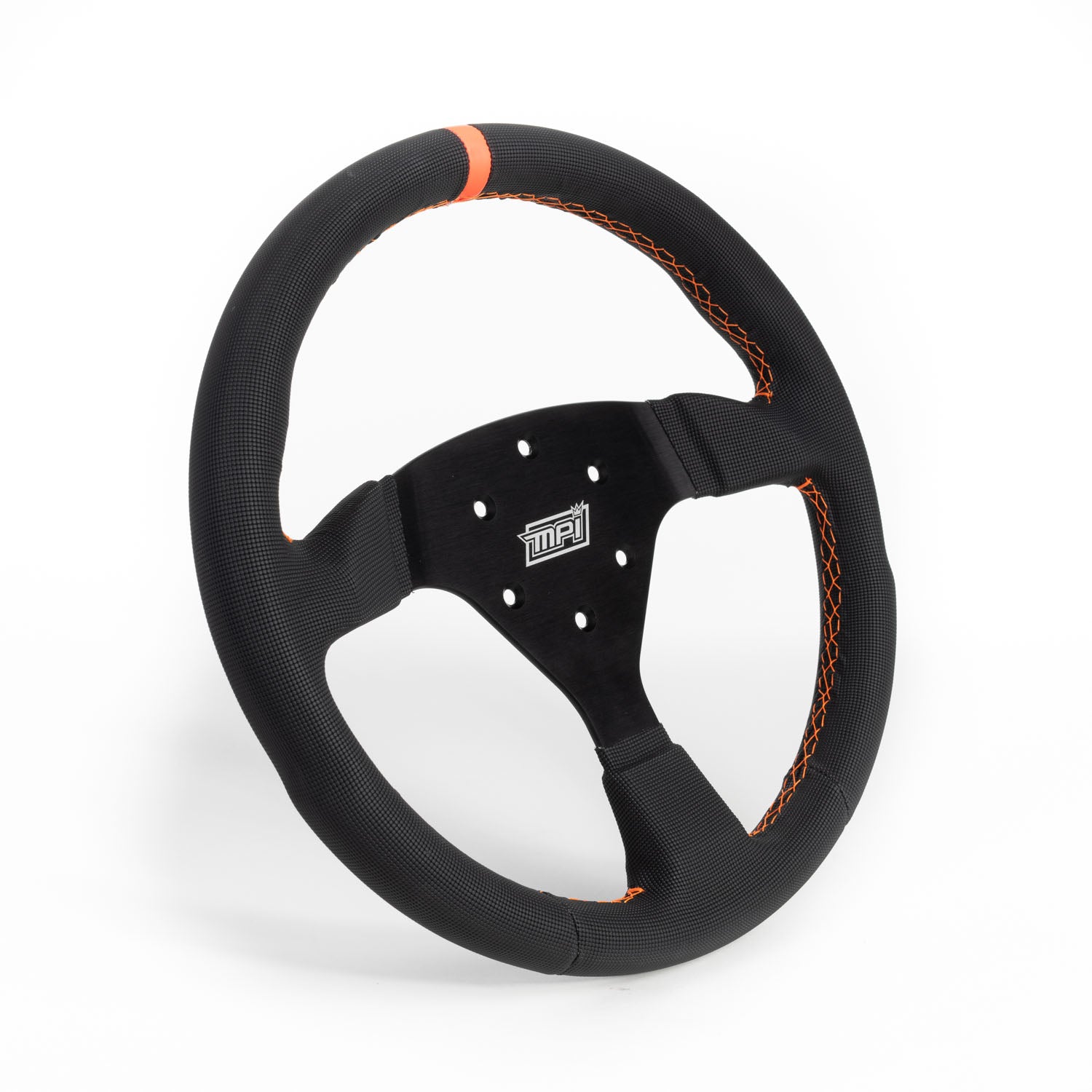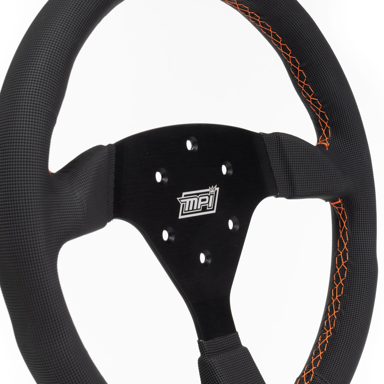 Safety is always in the forefront of all MPI products. The inner structure has been engineered to deform under elevated impacts, absorbing the load and reducing the effect on the drivers upper body, offering an engineered safety advantage. The inner foam injection has been developed to have the highest vibration absorption rate in the industry. The special oval shaped grip and extreme thumb inserts make the holding of the wheel a natural feel for the driver. The new aluminum structure features a unibody with no horn button for increase rigidity and durability.