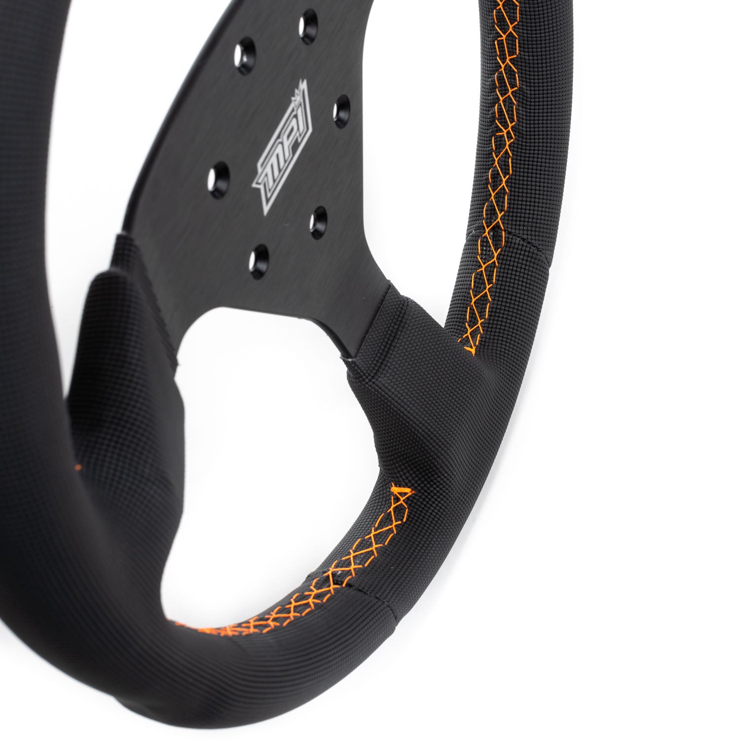 The MPI F Model Track Day is a multifunctional steering wheel that is offered in three different sizes with two different covering materials. Each variation of this wheel features the MPI Orange™ center marker. The selected suede covering and its parallel MPI Orange™ hand-stitched finish, give a very high grip feel, reducing the effort needed to hold the wheel while increasing driver feeling and giving a sporty look.