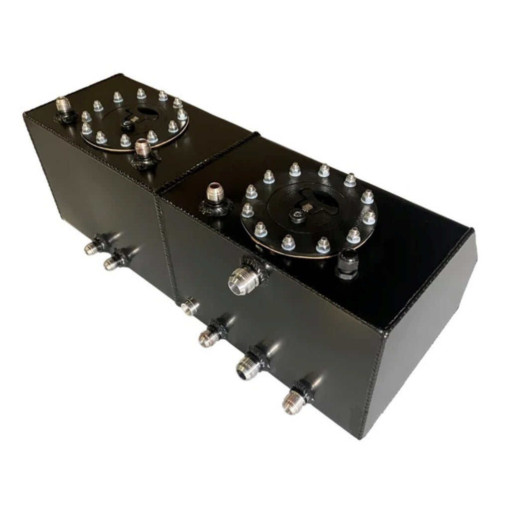 Combo packages offer the same performance benefits as the air/ice fuel cooler tanks but include the addition of a 4 or 5-gallon fuel cell on the side, simplifying plumbing and installation. Air/ice fuel cooler includes 12-bolt aircraft-style flush mount lid assembly, (2) -10AN fittings for fuel in/out, (2) -12AN fittings for ice water in/out, -8AN roll-over vent, and 3/8" NPT drain, while the fuel cell includes a 12-bolt aircraft-style flush mount lid assembly, -8AN fuel return, -8AN roll-over vent, and aircraft-type racing foam.