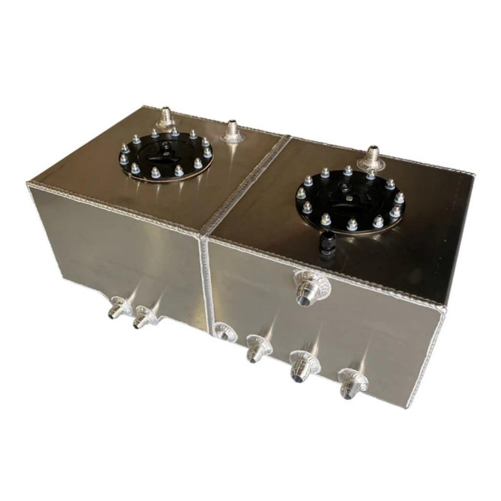 Combo packages offer the same performance benefits as the air/ice fuel cooler tanks but include the addition of a 4 or 5-gallon fuel cell on the side, simplifying plumbing and installation. Air/ice fuel cooler includes 12-bolt aircraft-style flush mount lid assembly, (2) -10AN fittings for fuel in/out, (2) -12AN fittings for ice water in/out, -8AN roll-over vent, and 3/8" NPT drain, while the fuel cell includes a 12-bolt aircraft-style flush mount lid assembly, -8AN fuel return, -8AN roll-over vent, and aircraft-type racing foam.