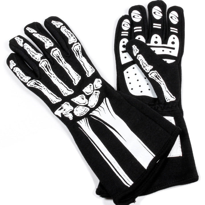RJS Skeleton Gloves incorporate identical material construction of traditional RJS driving gloves with the addition of the skeleton imprinted pattern. These gloves are double-layer which meet SFI 3.3/5 specifications. These gloves are available in several colors, including black/white, black/orange and black/lime green.