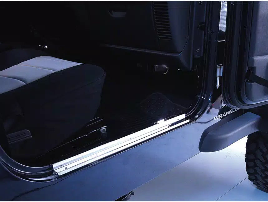 This Rugged Ridge Door Entry Guard Set is designed for 1997-06 Jeep Wranglers. The door entry guard protects the door threshold from damage. These guards have a 5-year limited warranty.