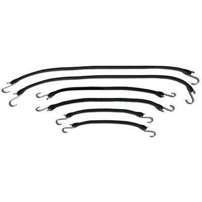 The ShurTrax 6-piece Rubber Tarp Strap Kit includes two each of size 15", 21", and 31" respectively. These multipurpose natural rubber tarp straps are great in environments with cold weather. They will not rot or lose elasticity with exposure to the elements. The black rubber straps feature rust-resistant hooks and are designed to meet the needs of both casual and professional users.