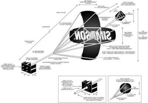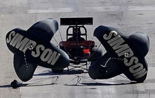 The Simpson Crossform Drag Racing Chute is a handmade 12-foot canopy drag parachute. It is designed for funny cars and dragsters.with speeds from 200 to 300+ mph.
