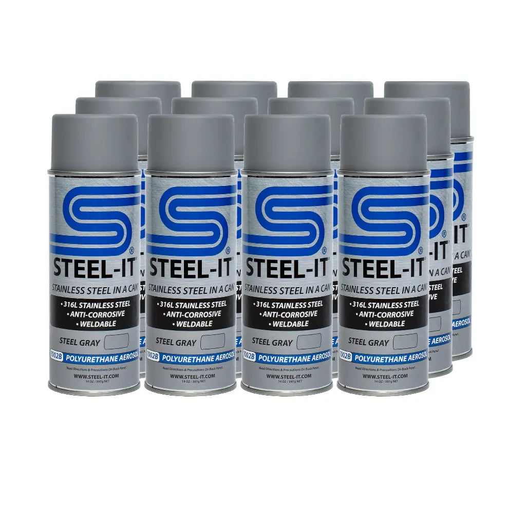 Paint - Stainless Steel in a Can - Polyurethane - Weldable - Non-Corrosive - Steel Gray - 14 oz Aerosol - Set of 12 - Brand: Steel-It - Part Number: CASE1002B