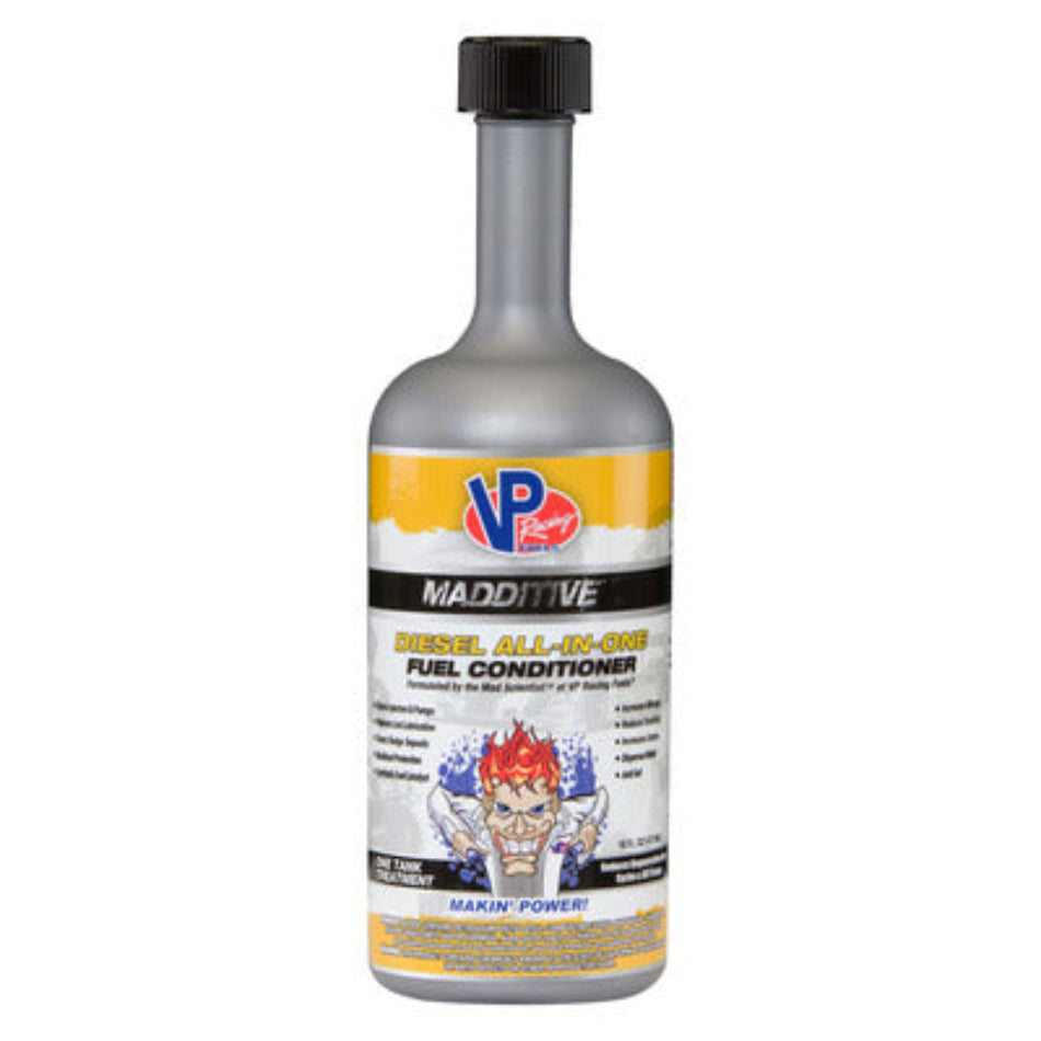 VP Racing Fuels Diesel All in One Madditive is a fuel conditioning additive. Treat your diesel right! Get more out of your diesel engine with Diesel All-In-One Fuel Conditioner. All-In-One Fuel Conditioner cleans injectors and pumps, increases cetane, and replaces lost lubrication. Increases fuel mileage and reduce smoking.